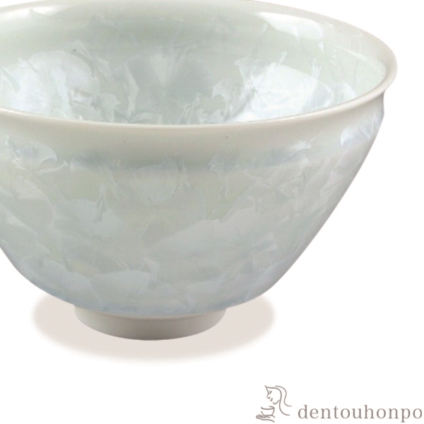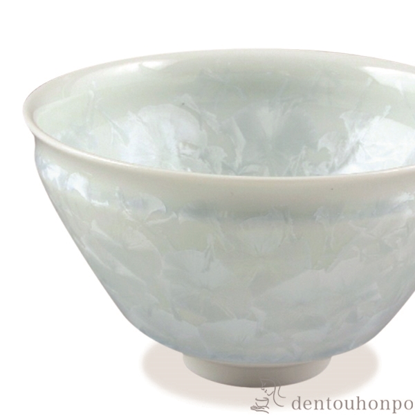 白く輝く結晶釉が美しい抹茶 です。鮮やかな抹茶の緑を更に引き立ててくれます。器の表面に花が咲いたような美しい器で、2つとして同じものができないのも特徴のひとつです。様々な結晶の形を楽んでいただける商品です。