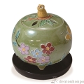 心和む緑交趾とパステルカラーの小花が、森の穏やかな暮しを想像させます。つまみの黄色いふくろうが可愛らしい香炉です。