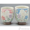 温かみのある粉引の素地に描かれた色とり、どりの野辺の花。その中で草を踏み分け遊ぶ兎の姿が愛らしい湯呑です。