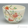 たわわに実る石榴の実が豊穣の喜びを伝えています。温かみのある色合いの御本手の生地に金彩が映える華やかな抹茶碗です。
