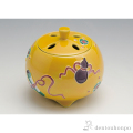 華やかな黄交趾の余白に、色とりどりの宝尽しの模様を表しました。縁起の良い香炉で、インテリアとして最適です。