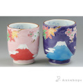 紫地には青富士、ピンクには赤富士を堂々と描いた、縁起の良い湯呑です。桜と紅葉を添え、季節を問わずご愛用頂けます。