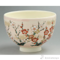 薄桃色を背景に、咲き誇る紅梅、白梅を力強く描いた抹茶碗です。金彩が華やかさを引き立てています。