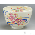 流水文様に大きく桜形を枠取りし、愛らしい桜の花を丁寧に描き詰めました。華やかな春にふさわしい抹茶碗です。