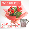【母の日限定】カーネーション(鉢植え)とご一緒に九谷焼マグカップをお届けいたします。銀彩の淡い色合いと釉薬の艶やかさを際立たせるように波打つフォルムが上品な佇まいのマグカップです。飽きの来ない椿の絵付けと落ち着きのある色合いが、母の日のプレゼントに人気のお品です。