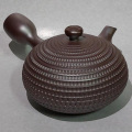 四日市萬古焼の伝統工芸士、舘正規作の急須です。正規の急須は一つ一つ轆轤で作ったとは思えない程の均一かつ精巧な造りで手に取る人を魅了します。陶土を主成分とし内面に釉薬を使用していない萬古焼急須は陶器・磁器のどちらでもなく「陶土器」になります。陶土器急須は土含まれる鉄分と茶葉の相性がいいので渋みを取りまろやかな味わいになることが特徴です。茶漉しはステンレス製ではなく一個一個手作業で開ける伝統技法「共茶漉し」が使用されています。ステンレス製の茶漉しと比べて茶渋の付着による目詰まりも起こりにくく長く愛用いただけます。