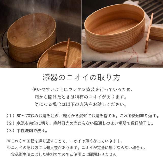 ・ 通常の曲げわっぱお弁当箱と比べて、隙間ができにくい構造を採用し強度・耐熱性の高いコーティングを施した。