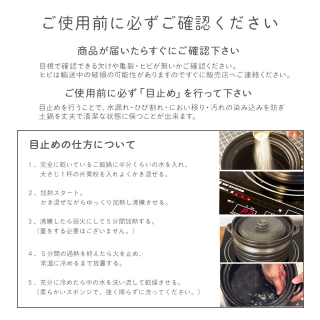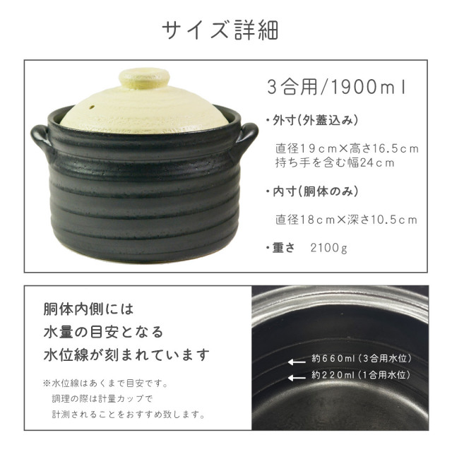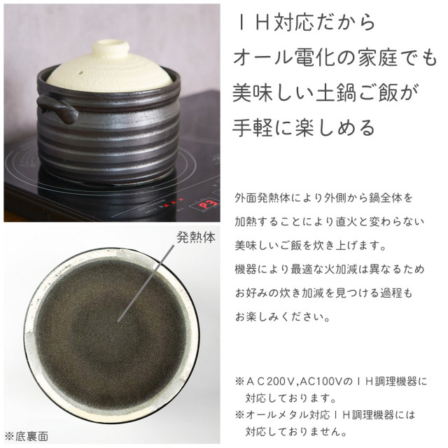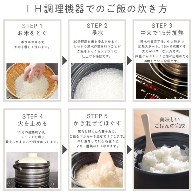 ※取り扱い説明書に記載の炊き方はあくまで目安となります。ガス・IH機器のメーカー・使用年数によって火力が異なりますので、お好みの炊き上がりとなるよう、ご自身で火加減の調整をしていただけますと幸いです。