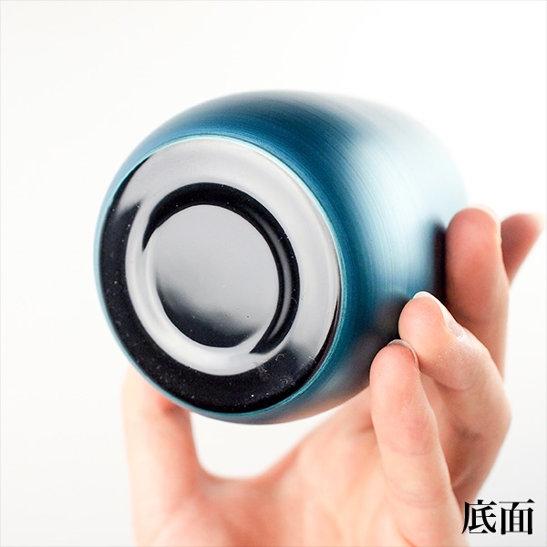 青漆を使用した目の覚めるような色合いが特徴です。モダンなデザインなのでインテリアとして置くだけで絵になります。また、使い込むほどに色味が変化していくので愛着が湧いてきます。ビアカップとしてはもちろんのこと、フリーカップとして普段使いできるカップです。