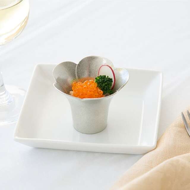 一つ一つ職人が手作業で仕上げています。錫は抗菌作用があるため、食器として安心してご使用いただけます。また、熱伝導率が高いため、冷蔵庫で器を1〜2分冷やすだけで器全体がよく冷え、冷たいお料理を一層お楽しみいただけます。