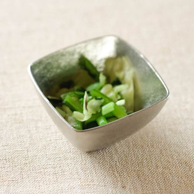 一つ一つ職人が手作業で仕上げています。錫は抗菌作用があるため、食器として安心してご使用いただけます。また、熱伝導率が高いため、冷蔵庫で器を1〜4分冷やすだけで器全体がよく冷え、冷たいお料理を一層お楽しみいただけます。
