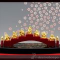 春の穏やかな陽差しの中、絢爛と咲きほこる優美な桜と清らかに流れる川。福の神とされる七福神が一堂に揃い、祝盃を片手に吉祥あふれる満面の笑顔で、なにか縁起の良い話をしています。そんな思わず笑みがこぼれそうな情景を、格調高くもほのぼのとした金の置物に仕上げました。