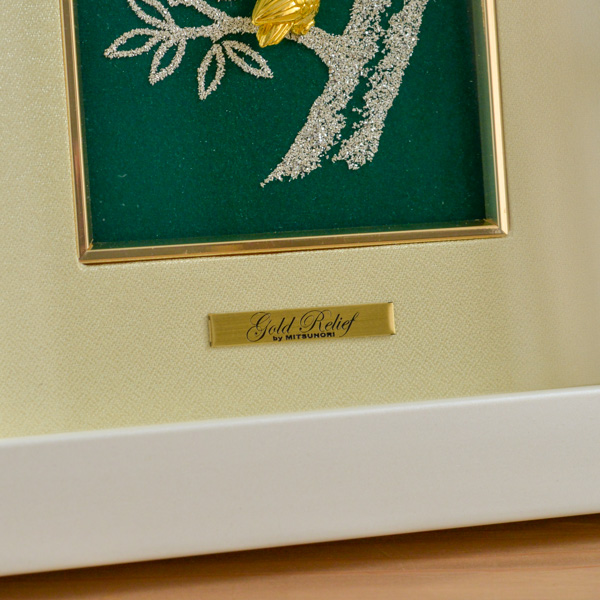純金と純銀の砂絵で描かれた贅沢なアートレリーフです。ふくろうは「物知り」「哲学者」といった知的なイメージを持つ動物で、首が回ることから「金運がつく」縁起物としても知られています。さらに、その名前から「不苦労」「福来」「富来老(豊かに年を取る)」といった様々な「幸福」を連想させ、吉祥のモチーフとして愛されています。足つきなので玄関やリビングなどに置いてもお使いいただけます。