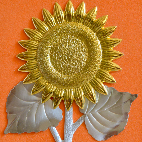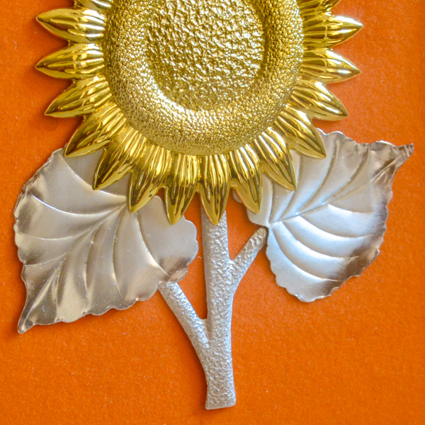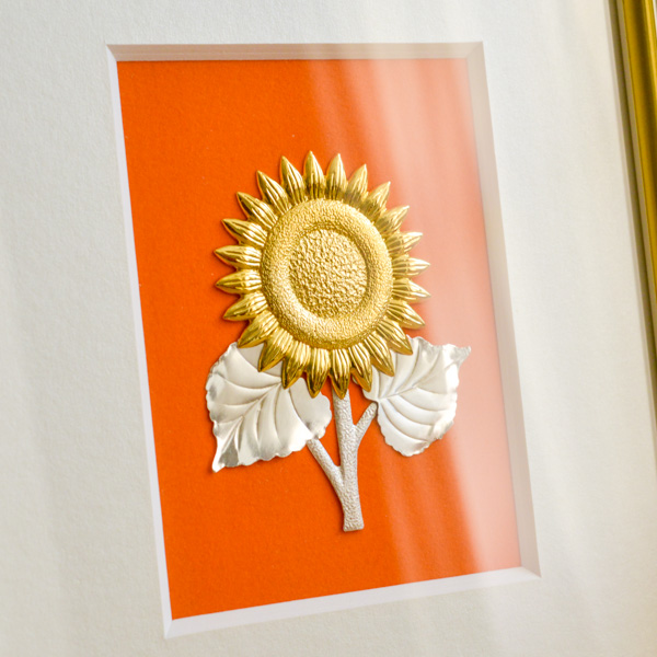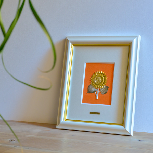 純銀による贅沢なアートレリーフです。リビングや寝室のインテリアとして存在感を放ちます。情熱的でエネルギッシュな印象のヒマワリのモチーフです。