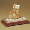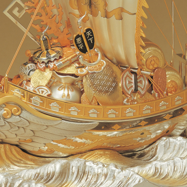 東京銀器が贈る、純銀製「宝船 鳳凰」。金銀に輝く鳳凰を船首に戴き、縁起物満載の豪華絢爛な逸品です。波間を進む姿は家運隆盛や商売繁盛の象徴。熟練職人による精巧な作りが空間を格調高く彩ります。大切な贈り物や記念品に最適です。