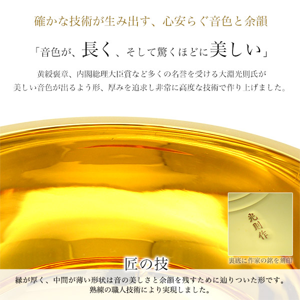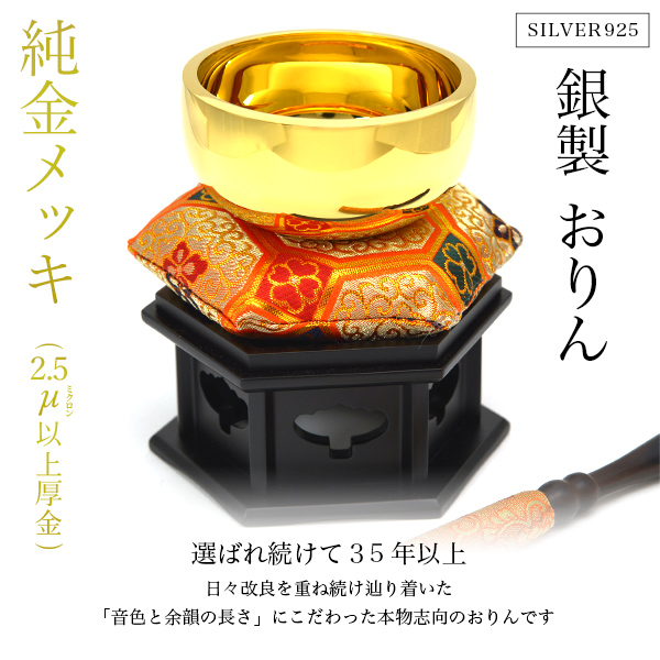 金工作家「光則」による「純金メッキの銀製おりん」。熟練の職人技術により美しい音色と長い余韻を実現しました。純金メッキは2.5ミクロン以上の厚金メッキ(出荷証明書付き)。お仏壇になじみの良いお色です。SILVER925の造幣局検定マーク入り。ご家族の心のよりどころのお仏壇に、気品あふれる、そして澄みきった優雅な音色の「おりん」をお飾りして、ご先祖の御霊をご供養くださいませ。「家紋・家名名入れ」をご希望の方は、ご対応させていただきます。