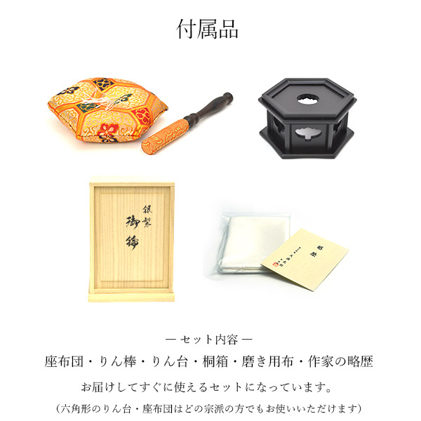 - りん台、りん棒、座布団、布(風呂敷)、作家の略歴が付属します。