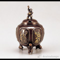 高岡銅器の発祥地は、千保川沿いの金屋町です。慶長14年 (1609)、高岡に城を築いた加賀藩の2代目藩主・前田利長公が、近郷から7人の鋳物師 (いもじ) を招いたのが始まりとされています。明治6年 (1873)にウィーン万国博覧会で金森宗七が有効賞を受賞したのを皮切りに、国内外で多くの名工たちが賞を受け、その精巧な作風により、世界に確固たる地位を築きました。