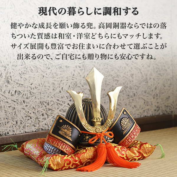 高岡銅器の匠の技が光る兜と座布団のシンプルなセットです。「出世兜」は、古くから健やかな成長を願うために使われ、端午の節句、誕生祝い、新築祝いなどに贈られます。古代の名将が愛用した兜を模しており、和室の床の間や洋風の客間や書斎にも調和するデザインです。国内外の贈答品としてもおすすめです。