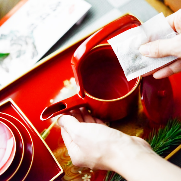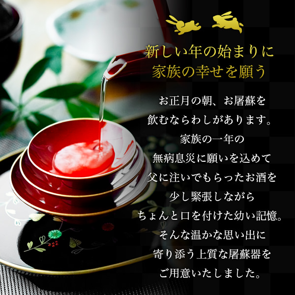 ロングセラーの「うさぎ唐草」シリーズから屠蘇器(とそき)が登場しました。可愛らしい二匹のうさぎと唐草模様が、お正月などの晴れの日の盛り上げてくれます。黒い屠蘇台には朱色の酒器が大変よく合います。