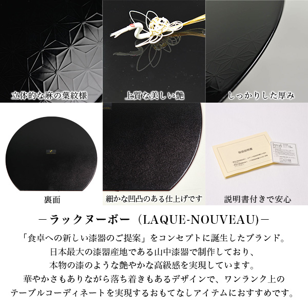 テーブルコーディネートをワンランクアップさせてくれる半月盆(プレースマット/ランチョンマット)です。山中漆器の技術により本物の漆のような艶やかさ、上品さと、扱いやすさを兼ね備えています。お正月や年末年始のおせち、祝いの席の懐石料理やおもてなしにオススメです。麻の葉は魔除けや成長を願う意味が込められた吉祥模様です。ラックヌーボー(LAQUE-NOUVEAU)は、「漆器 =LACQUER-WARE」と「新しい = NOUVEAU」を合わせたその名のごとく“ 食卓へ新しい漆器のご提案”をコンセプトに誕生しました。半世紀にわたり、ヨーロッパ、アメリカ等世界各地に日本の伝統的な漆器の魅力を紹介し続け、個性豊かにテーブルをコーディネートする方々にお贈りする素敵なコレクションです。