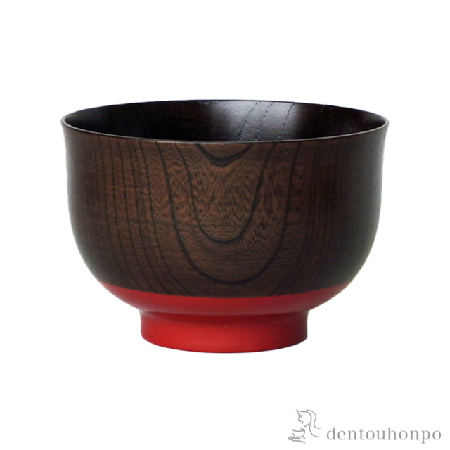 渕が端反の形で口当たりが良く、具材をたっぷりとよそえろ木製の汁椀です。塗分は、高台近くに茜すりには黒漆、神代すりには朱漆で艶やかに塗り分けがされております。拭き漆と真塗の色合いのコントラストをお楽しみください。