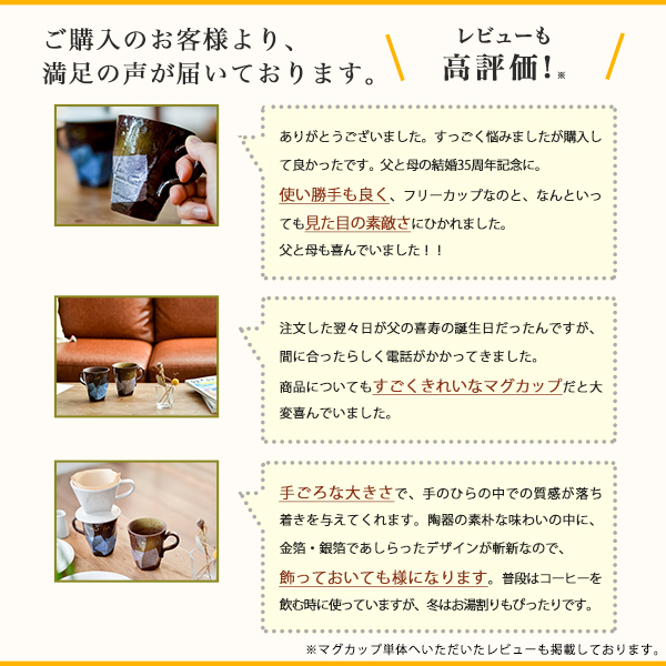 ご結婚や退職、金婚式などお祝いに大人気のペアマグカップを専用の木箱に入れ、お好みの言葉を木箱の蓋裏にレーザー印字しお届けします。銀箔には、九谷焼の透き通るような2色の絵具で色付けをし、口もとには「金銀」が舞うように散らされています。職人の技が随所にあり、一段と上質な時間を演出してくれるマグカップです。