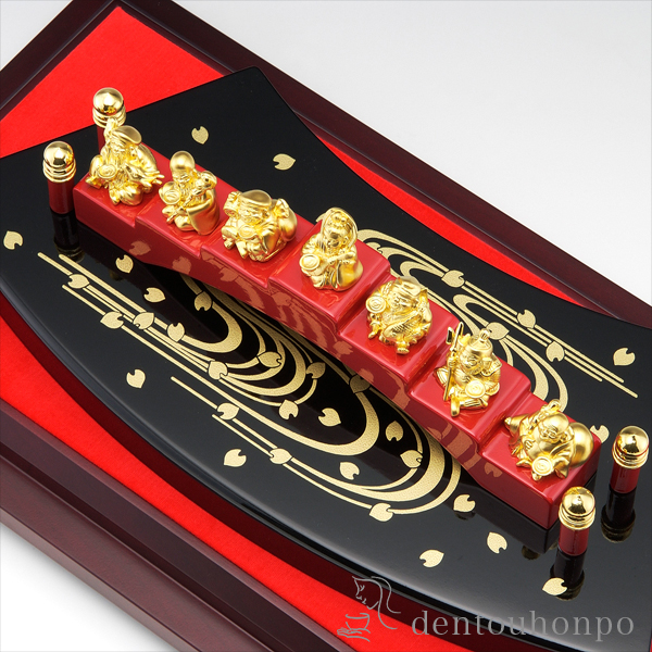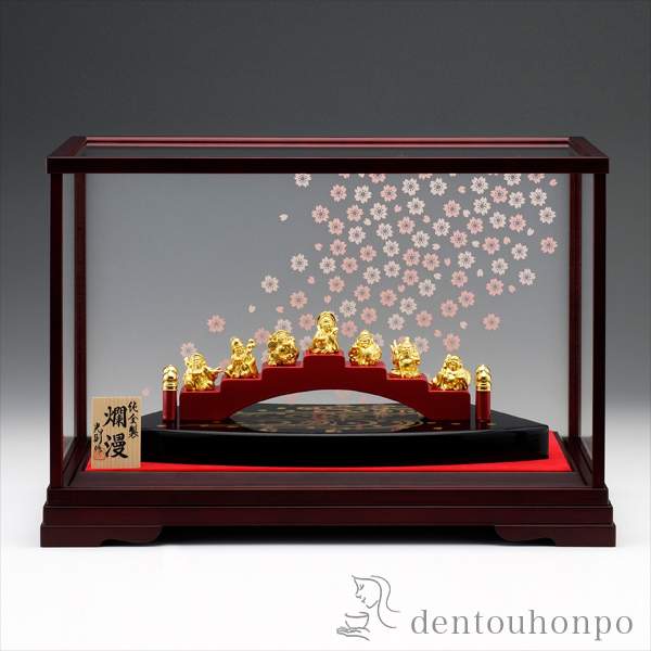 春の穏やかな陽差しの中、絢爛と咲きほこる優美な桜と清らかに流れる川。福の神とされる七福神が一堂に揃い、祝盃を片手に吉祥あふれる満面の笑顔で、なにか縁起の良い話をしています。そんな思わず笑みがこぼれそうな情景を、格調高くもほのぼのとした金の置物に仕上げました。